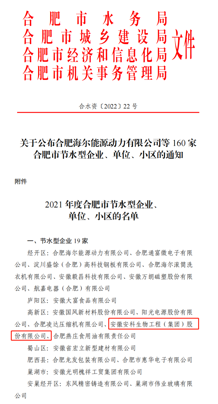 近日,合肥市水務局、合肥市城鄉(xiāng)建設局、合肥市經(jīng)濟和信息化局、合肥市機關事務管理局對2021年合肥市節(jié)水型企業(yè)進行表彰,安科生物榮獲“合肥市節(jié)水型企業(yè)”稱號。同時,由于公司在2021年度節(jié)水創(chuàng)建中表現(xiàn)突出,經(jīng)合肥高新區(qū)最嚴格水資源領導小組審定,入選2021年度節(jié)水激勵獎勵名單。