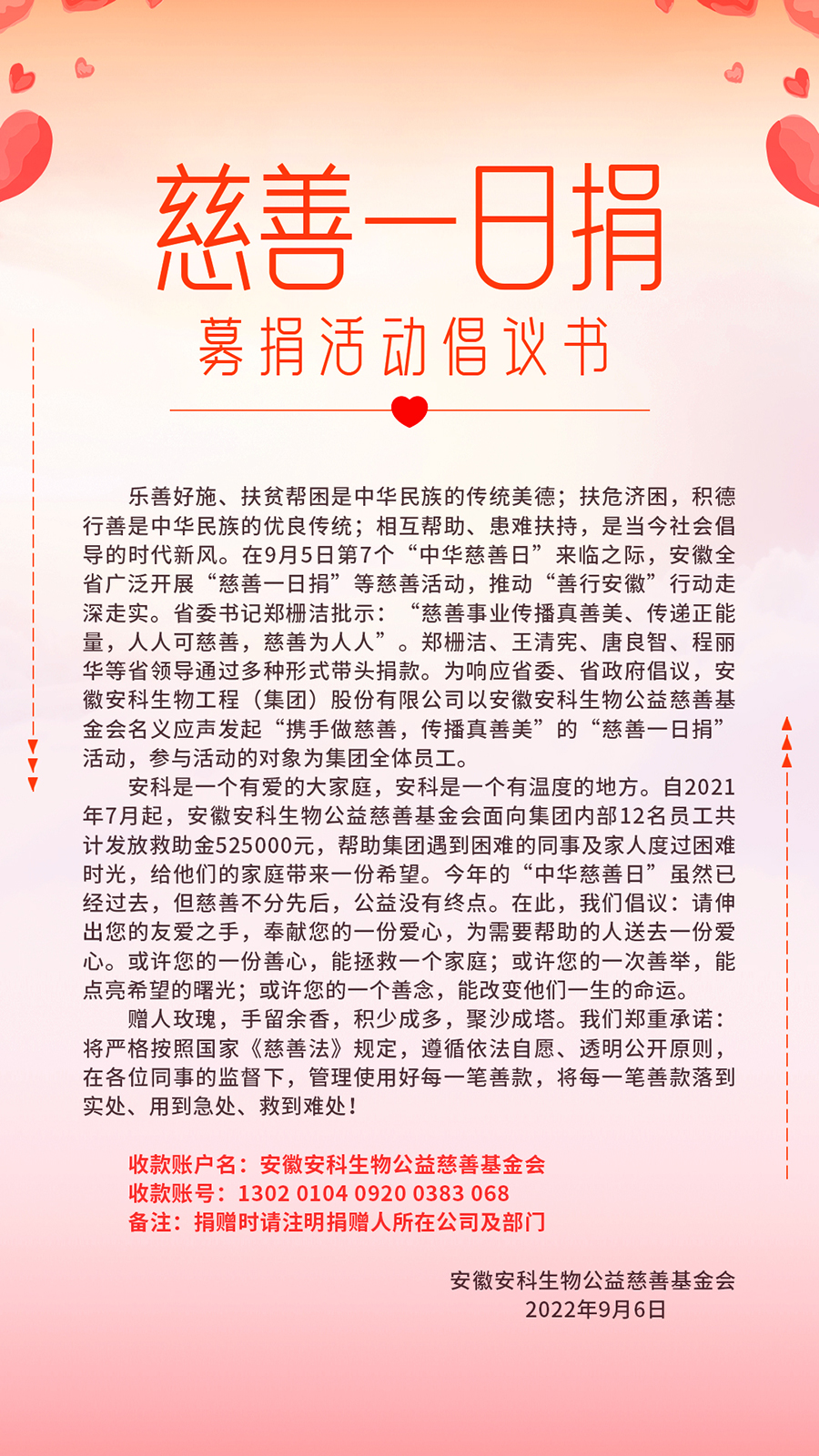 第七個(gè)“中華慈善日”來(lái)臨之際,安徽全省廣泛開(kāi)展“慈善一日捐”等慈善活動(dòng),推動(dòng)“善行安徽”行動(dòng)走深走實(shí)。為積極響應(yīng)省委、省政府號(hào)召,安科生物聯(lián)合安徽安科生物公益慈善基金會(huì)面向集團(tuán)全體員工,發(fā)起了“慈善一日捐”倡議,動(dòng)員全體員工伸出友愛(ài)之手,奉獻(xiàn)一份愛(ài)心。全體員工積極用愛(ài)心傳遞真情,截至本次發(fā)稿,已有50多位員工捐贈(zèng)善款達(dá)3萬(wàn)余元。