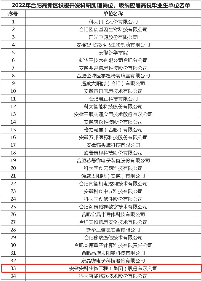 2022年合肥高新區積極開發科研助理崗位、吸納應屆高校畢業生單位部分名單