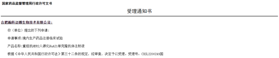 瀚科邁博HuA21注射液聯合用藥臨床試驗申請獲受理