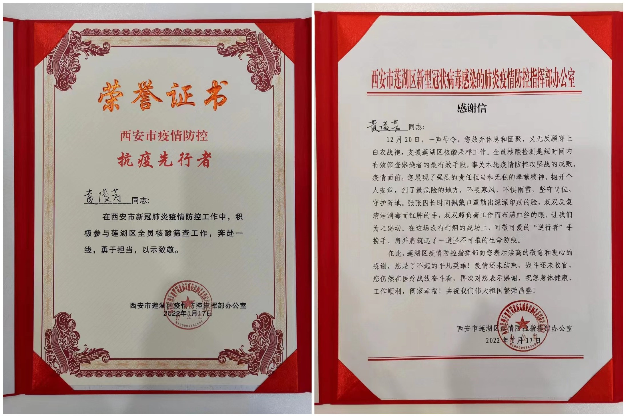 2021年12月爆發(fā)的西安疫情,牽動(dòng)著無(wú)數(shù)人的心。2021年12月9日0時(shí)至27日24時(shí),西安市累計(jì)報(bào)告本土確診病例811例,是自武漢以來(lái),在一個(gè)超大城市所發(fā)生的病例數(shù)最多、規(guī)模最大的一次本土疫情。西安市從2021年12月23日午夜12時(shí)起啟動(dòng)封城。面對(duì)復(fù)雜嚴(yán)峻的疫情防控形勢(shì),黃俊芳于第一時(shí)間報(bào)名所在區(qū)域的全員核酸篩查工作,以實(shí)際行動(dòng)詮釋了白衣天使的使命擔(dān)當(dāng)。在這封寄來(lái)的感謝信上,對(duì)黃俊芳拋開個(gè)人安危,在最危險(xiǎn)的地方,不畏寒風(fēng)、不懼雨雪,堅(jiān)守崗位、守護(hù)陣地,展現(xiàn)出的責(zé)任擔(dān)當(dāng)和無(wú)私奉獻(xiàn)精神表示了高度的贊賞與肯定。