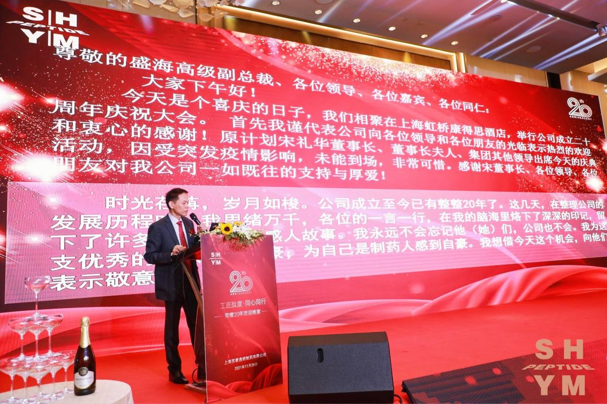 2021 年 11 月 26 日,對(duì)蘇豪逸明人來(lái)說(shuō)是個(gè)值得慶賀的日子。以工匠“肽”度 同心同行為主題的上海蘇豪逸明公司成立 20 周年慶祝大會(huì),在上海虹橋康得思酒店成功舉辦。因上海突發(fā)疫情影響,宋禮華董事長(zhǎng)等集團(tuán)領(lǐng)導(dǎo)未能如愿參加此次活動(dòng),由安科生物集團(tuán)高級(jí)副總裁盛海代表集團(tuán)出席了活動(dòng)。活動(dòng)當(dāng)天,蘇豪逸明創(chuàng)始人、總經(jīng)理周逸明、執(zhí)行董事周大為等領(lǐng)導(dǎo)及蘇豪逸明全體員工共同參會(huì)。