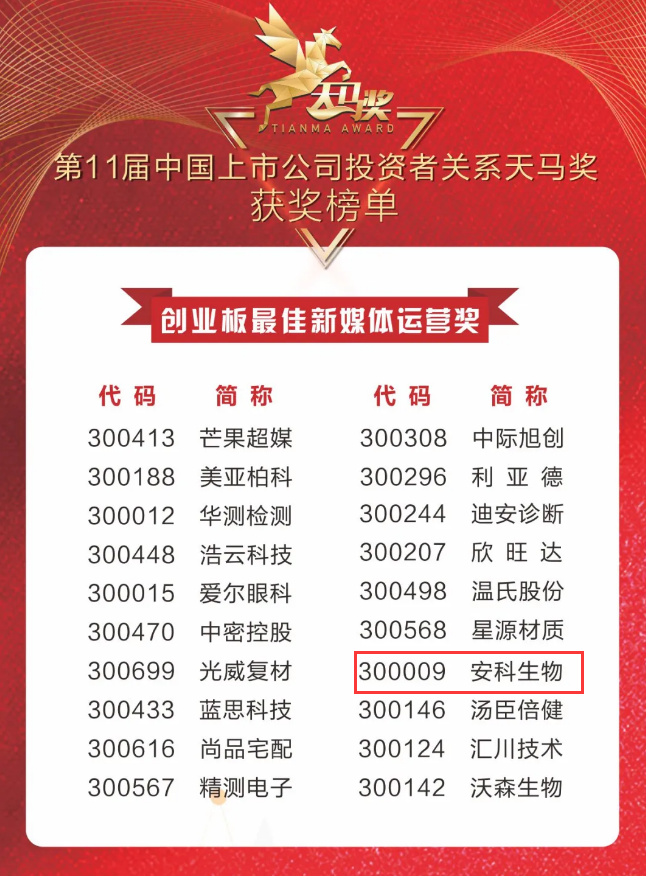 近日,由證券時報社主辦,中證中小投資者服務中心擔任指導單位的“第11屆中國上市公司投資者關系天馬獎”獲獎榜單公布,安科生物獲頒最佳新媒體運營獎。