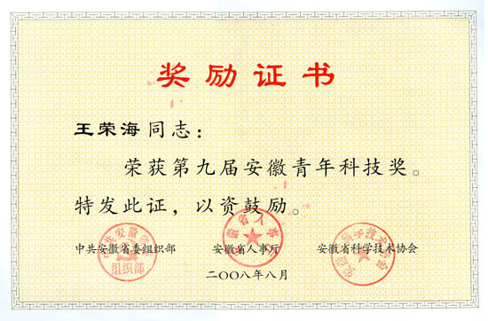 安徽青年科技獎由中共安徽省委組織部、安徽省人事廳、安徽省科學技術協會共同設立,旨在進一步實施科教興皖戰略、人才強省戰略和可持續發展戰略,大力推進自主創新,培養造就一流科學家和科技領軍人才,至今共頒發了九屆,我公司科研人員先后有宋禮華、楊玲、范清林、付永標、王榮海等五位同志獲此殊榮。體現了安科研發團隊的的綜合實力。