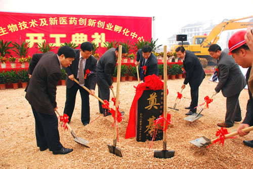 二00七年十月三十日,合肥高新技術產業開發區,紅楓路與香樟大道交叉口一派喜慶氣氛,這里彩旗飄揚,氣球高懸,鞭炮齊鳴,“安徽生物技術及新醫藥創新創業孵化中心”建設開工儀式在這里隆重舉行,省發改委、省經委、省科技廳有關領導,合肥市及高新區相關部門領導出席開工儀式并為建設工程奠基。
