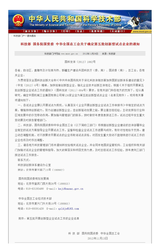近日,從科技部網站獲悉,國家科技部、國務院國資委、中華全國總工會聯合發布的《關于確定第五批創新型試點企業的通知》中,安科生物名列其中被確定為國家第五批創新型試點企業。