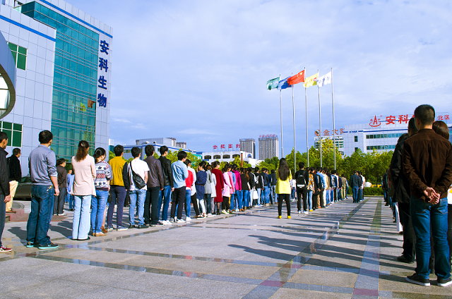 在鏗鏘有力的口令下,雄壯的國歌奏響,每周一上午八點半,在位于合肥市國家高新技術(shù)產(chǎn)業(yè)開發(fā)區(qū)的安徽安科生物工程(集團)股份有限公司南區(qū)北廣場,公司全體領(lǐng)導和員工肅然立正,昂首挺胸,向緩緩升起的五星紅旗行注目禮……