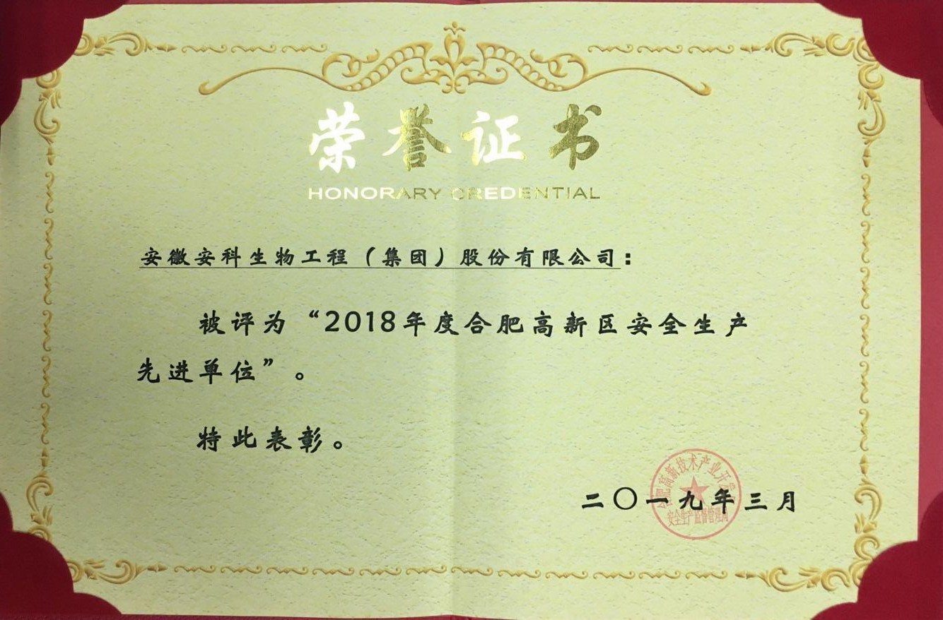 近日,安科生物收到合肥市高新區(qū)安全生產(chǎn)監(jiān)督管理局頒發(fā)的“2018 年度高新區(qū)安全生產(chǎn)先進單位”榮譽證書,旨在表彰公司在 2018 年度安全生產(chǎn)管理工作中取得的成績。