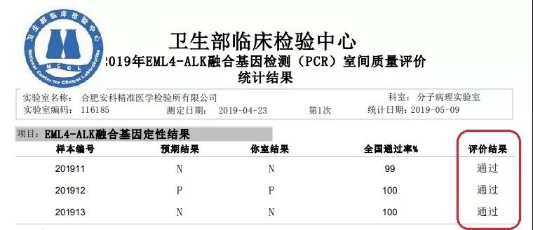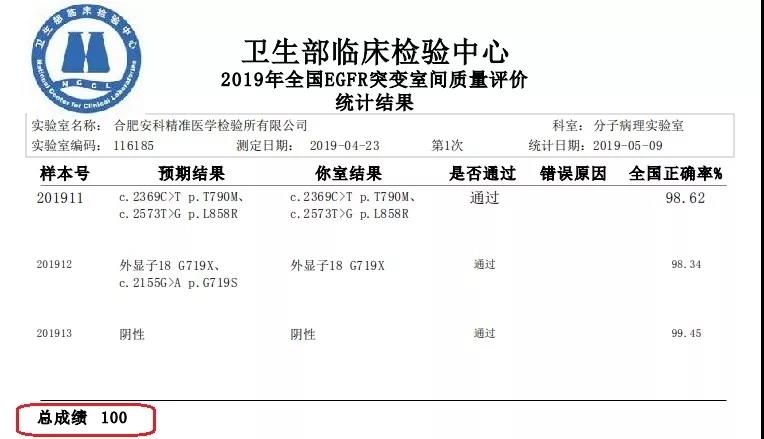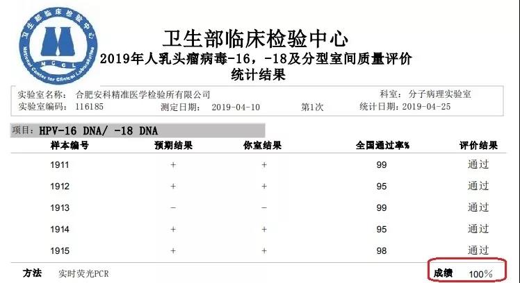 近日,國家衛生健康委臨床檢驗中心(NCCL)相繼發布了關于 2019 上半年人乳頭瘤病毒-16,-18及分型,EGFR 突變,乳腺癌 HER2 擴增 FISH 檢測,EML4-ALK 融合基因檢測(PCR)等室間質評結果。合肥安科醫學檢驗實驗室斬獲全滿分的成績。