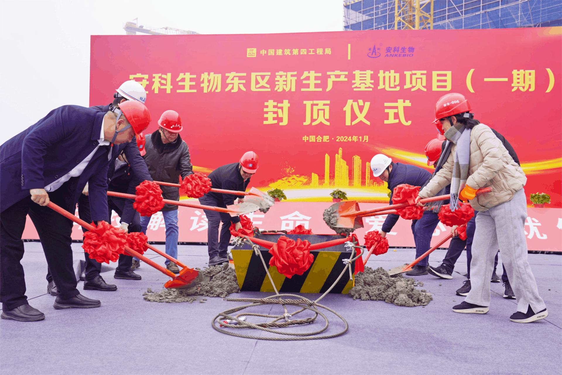 儀式上,安科生物董事長宋禮華、中建四局江蘇分公司黨委書記、總經理周云富,安徽省建設工程項目管理有限公司副總經理劉坤出席活動儀式,并分別發表熱情洋溢的致辭,共同對項目首棟主體結構的建成表示熱烈的祝賀。同時,安科生物執行總裁姚建平、相關部門領導及施工方單位、監理單位等領導代表親臨儀式現場,共同見證這一喜慶時刻。