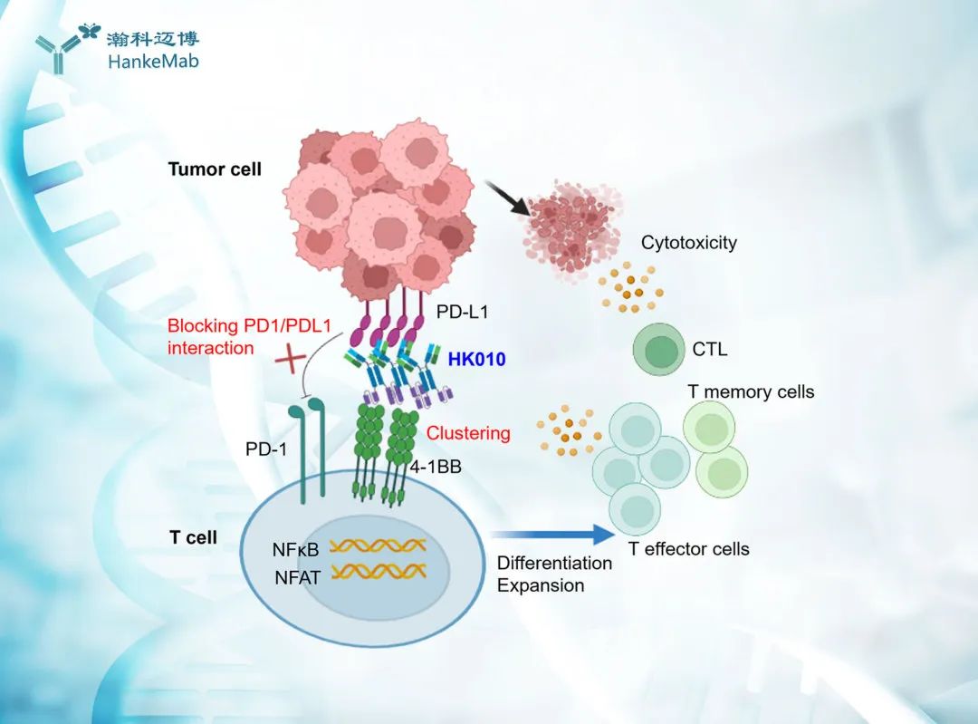 HK010注射液是一種針對人體PD-L1和人體4-1BB的雙特異性抗體,由瀚科邁博ISETbody雙抗技術平臺開發。HK010旨在聯合免疫抑制型和激動型靶點,一方面阻斷PD-L1/PD-1免疫抑制作用,另一方面通過PD-L1靶向腫瘤,并條件性激活4-1BB共刺激信號,從而達到解除免疫抑制和激活免疫系統的雙重作用,在增強藥效的同時,提高安全性,是一款極具潛力的抗腫瘤雙特異性抗體。