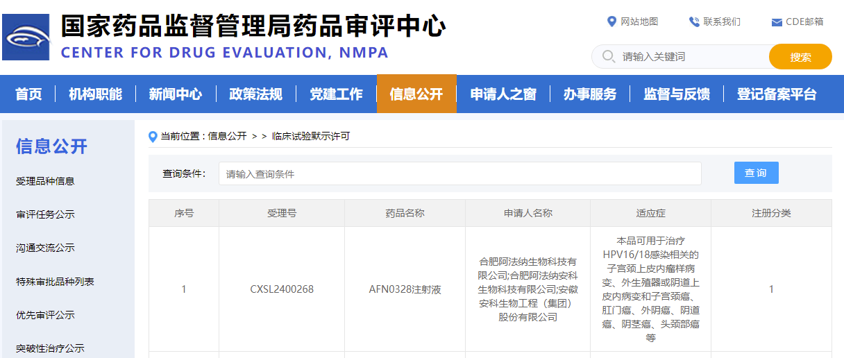 2024年7月18日,據國家藥品監督管理局藥品審評中心(CDE)官網公示,安徽安科生物工程(集團)股份有限公司與合肥阿法納生物科技有限公司聯合研制的1類新藥AFN0328注射液臨床試驗(IND)申請獲得批準,成為國內第二款獲批開展臨床試驗的HPV相關腫瘤mRNA治療型疫苗,同時也是國內唯一能覆蓋HPV18亞型腫瘤的mRNA疫苗。