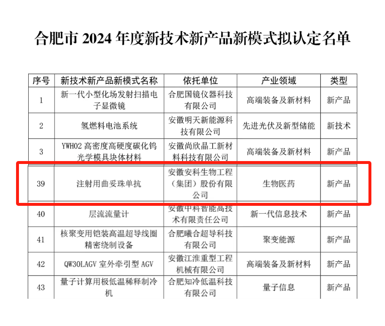 為加快實現合肥市高水平科技自立自強,促進關鍵技術領域國際、國內創新產品研發和產業化,推動科技成果轉化,近日,市科技局組織根據《合肥市新技術新產品新模式認定及推廣實施方案(試行)》(合科創委辦〔2022〕16號)文件要求,開展了合肥市2024年度新技術新產品新模式認定工作。經專家評審和會議研究,安徽安科生物工程(集團)股份有限公司自主研發并已獲批上市的安賽汀(注射用曲妥珠單抗)成功入選《合肥市2024年度新技術新產品新模式擬認定名單》,在“生物醫藥”領域被認定為“新產品”類型。