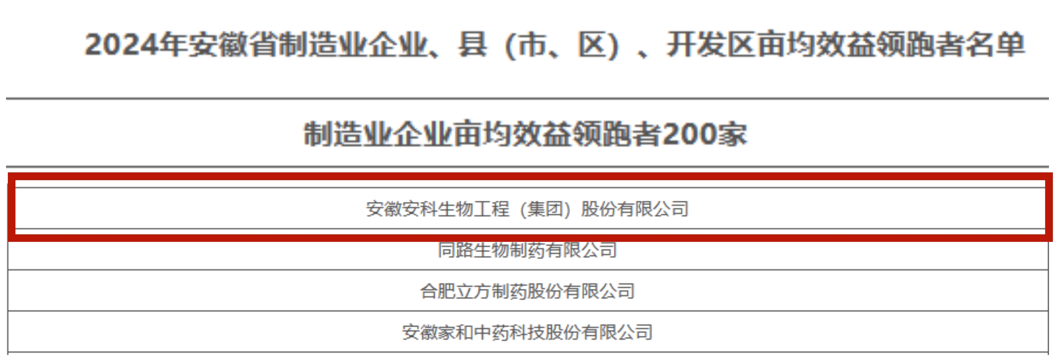 近日,安徽省2024年“畝均效益領跑者”發布會在蕪湖舉行。會上,發布了“2024年安徽縣(市、區)畝均效益領跑者”“2024年安徽制造業企業畝均效益領跑者”“2024年安徽省級以上開發區畝均效益領跑者”等名單。安徽安科生物工程(集團)股份有限公司成功入選“2024年安徽制造業企業畝均效益領跑者”名單,合肥高新技術產業開發區獲評“2024年安徽省國家級高新技術產業開發區畝均效益領跑者”。