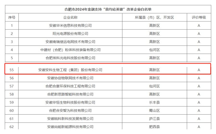 在此之前,合肥市制造強市建設工作機制辦公室公布了合肥市2024年金融支持“畝均論英雄”改革企業白名單,其中安徽安科生物工程(集團)股份有限公司成功入選并獲評A級。