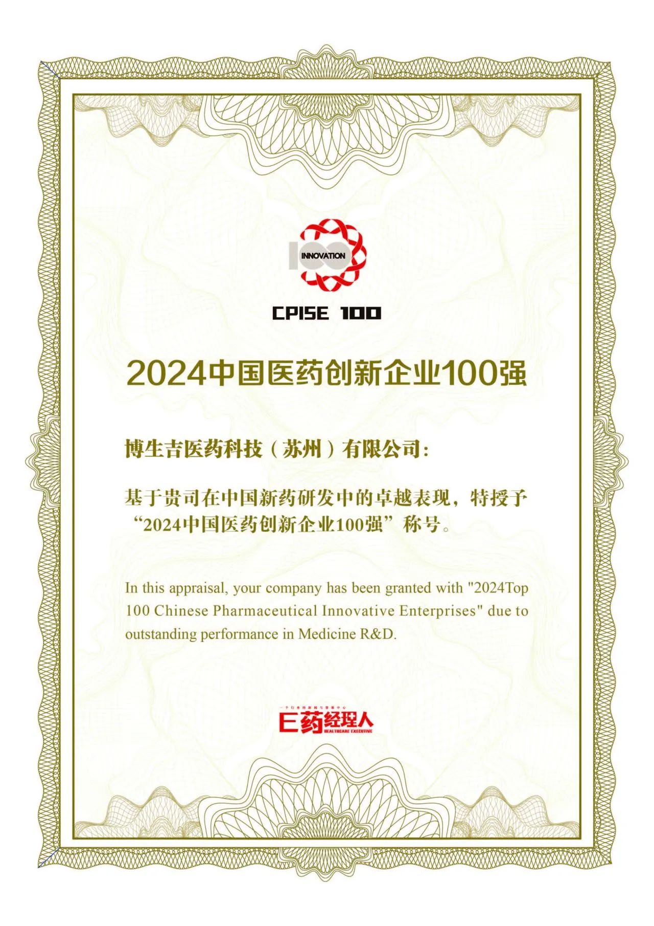此前,憑借其在細胞治療領域的卓越創新能力和顯著研發成果,榮登“2024中國醫藥創新企業100強”榜單。這一榮譽不僅彰顯了博生吉在醫藥創新領域的重要地位,更體現了業界對博生吉在整個醫藥創新行業里引領與推動作用的高度認可。