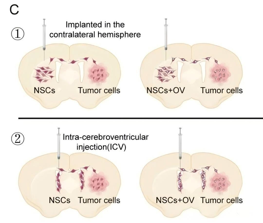 該項研究首次系統(tǒng)性地驗證了神經(jīng)干細(xì)胞(NSCs)作為YSCH-01溶瘤病毒載體的可行性、安全性與高效性,并通過腦室內(nèi)注射(ICV)這一創(chuàng)新給藥方式,實現(xiàn)了病毒能夠精準(zhǔn)靶向到中樞神經(jīng)系統(tǒng)內(nèi)的腫瘤。