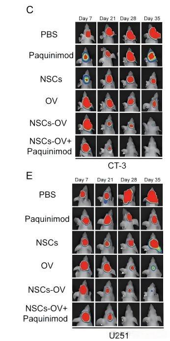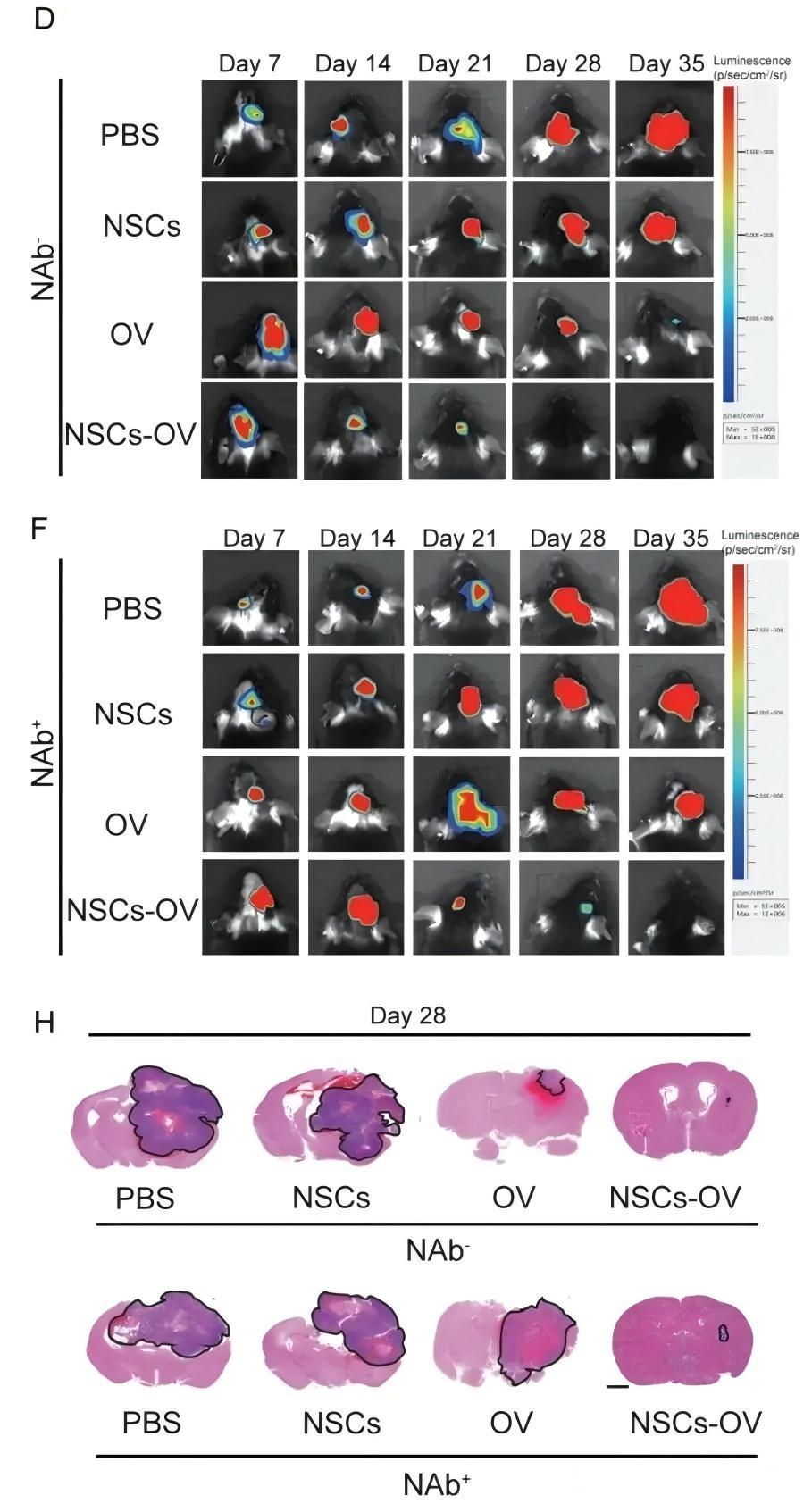 研究表明,該方案有效繞過了傳統(tǒng)治療的血腦屏障限制,顯著增強了YSCH-01在GBM 病灶區(qū)的富集效率與抗腫瘤效果。腦室內(nèi)注射,再利用 NSCs 的腫瘤靶向性,實現(xiàn)了YSCH-01 在腦腫瘤組織內(nèi)的全方位分布,在提高局部病毒活性的同時有效降低了全身毒性。該遞送系統(tǒng)還克服了中和抗體對病毒的清除,使得YSCH-01在腫瘤微環(huán)境中能夠持續(xù)復(fù)制,顯著延長抗腫瘤作用周期,為持續(xù)改善 GBM 患者的臨床預(yù)后提供了重要技術(shù)突破。